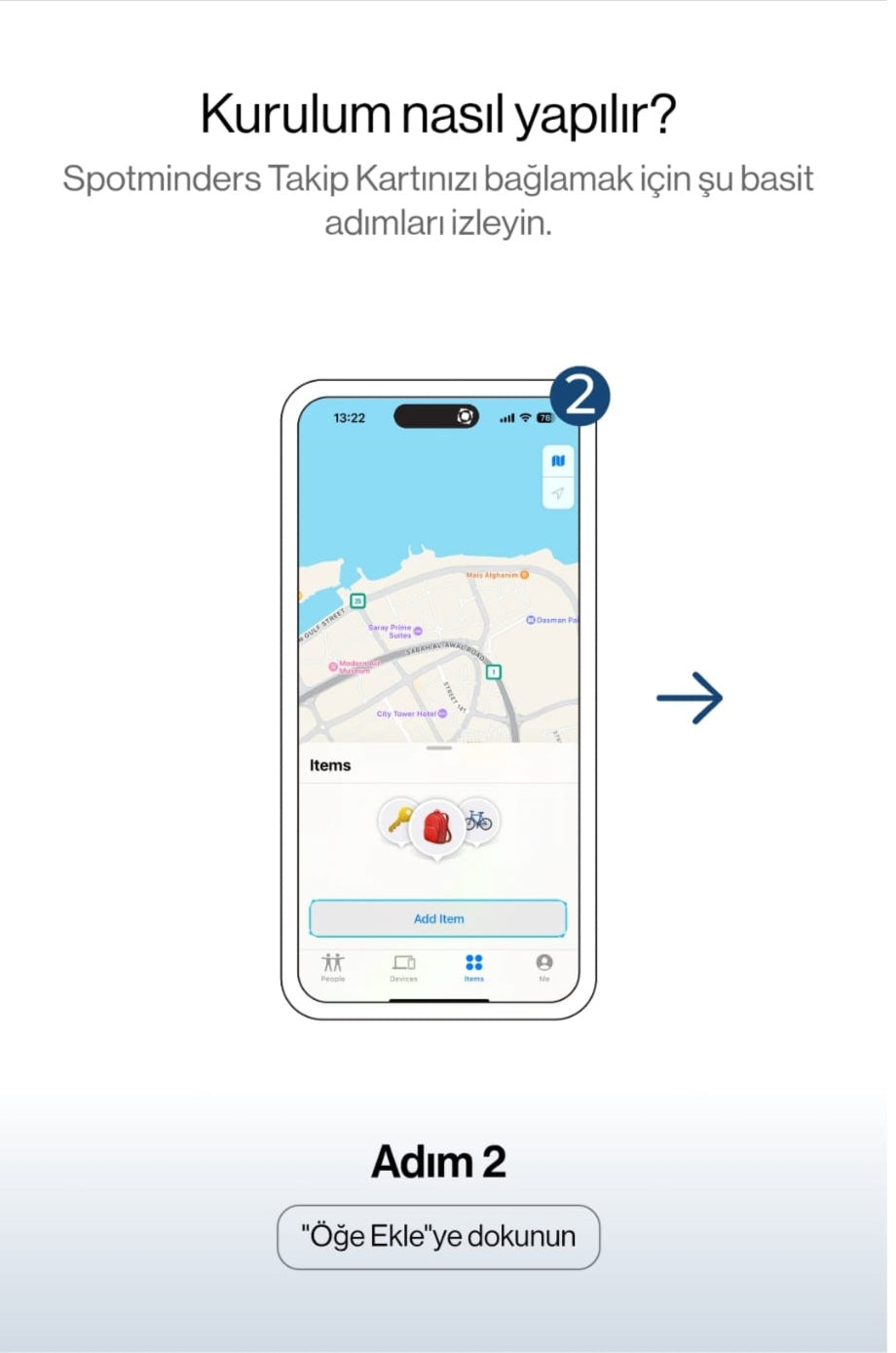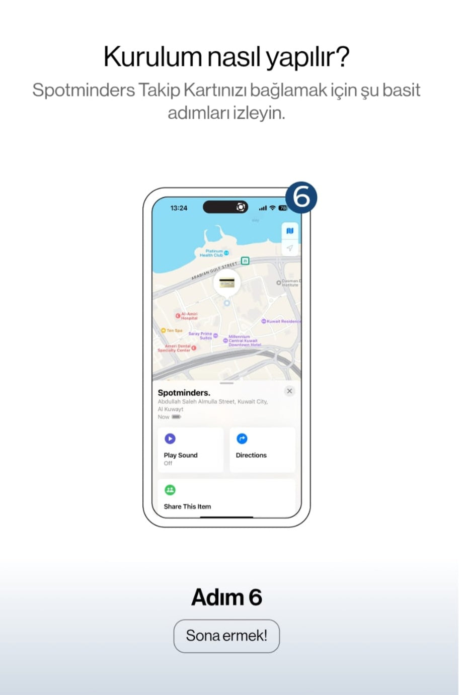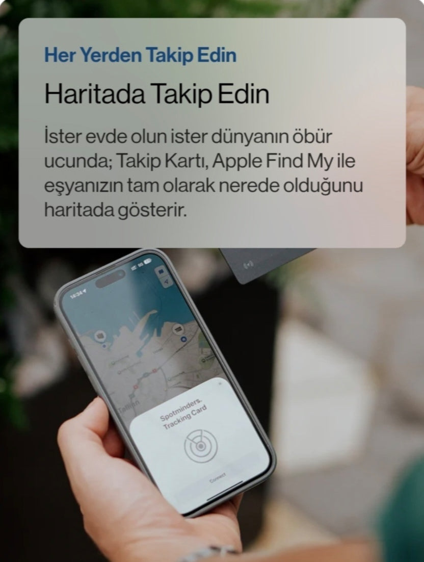Spotminders Takip Kartı şu anda yalnızca Apple cihazları ve Find My uygulamasıyla kullanılmak üzere optimize edilmiştir. Ancak, gelecekte diğer platformlarla uyumluluğu genişletme fırsatlarını sürekli olarak araştırıyoruz.