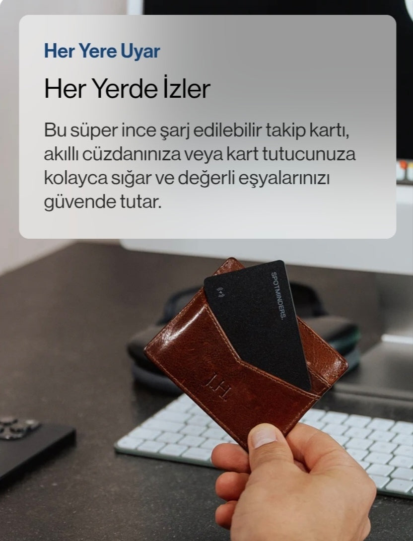 Evet, Spotminders Takip Kartı sadece cüzdanınızla sınırlı değil. Bavul, çanta, telefon, pasaport ve daha birçok eşyanızı takip etmek için kullanabilir, günlük ihtiyaçlarınız için kapsamlı takip çözümleri sunabilirsiniz.